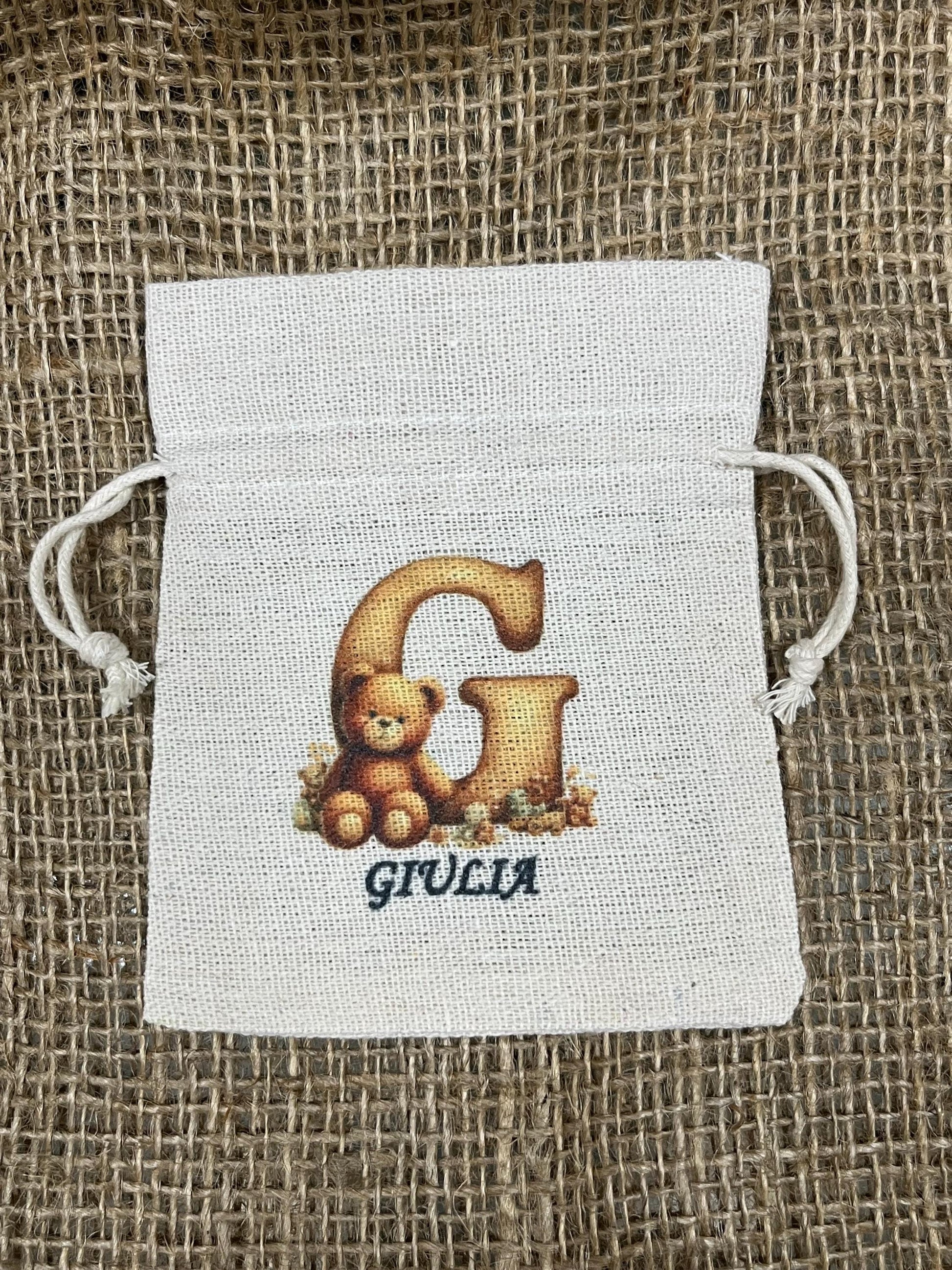 il sacchetto è realizzato con tela di cotone color panna da un lato e’ possibile la personalizzazione della lettera dell’alfabeto da voi scelta e il nome .